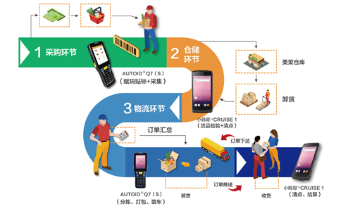 在整個供應鏈運營環節中,美菜與東集手持采集終端攜手打造了一套全流程精細化的管控方案,有效縮短農產品流通環節,降低商戶成本的同時,大大降低運輸環節帶來的損耗,保證了農產品的新鮮度,確保食品安全。與此同時,通過大數據技術,美菜實現了采購與倉儲的即時調控,減少壓貨風險,促進合理分配。