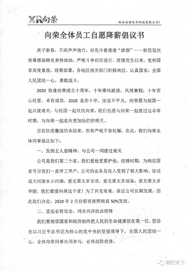 2020,是“你”十年;雖然我們國家正在受著新冠肺炎疫情的影響,但是看到國家領導人能把十幾億人管理的這么井井有條,心里真為生在中華大地而慶幸和驕傲。今天又看到向榮人寫的這份自愿降薪倡議書,心里感到莫名的感動與幸福。