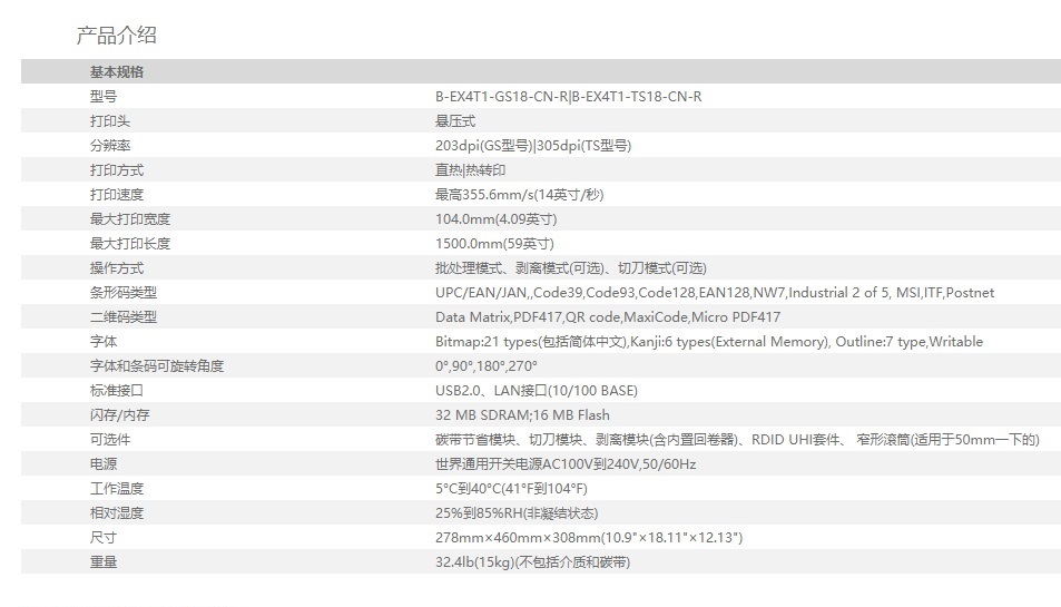 EX4T1系列支持東芝特色的懸壓打印和碳帶節省功能,支持自動檢測打印頭分辨率、自動診斷打印頭狀態、DHCP地址顯示和自動走退紙至默認位置的功能。與此同時,此系列采用以太網和USB2.0為標準端口,支持并口、串口和無線LAN等可選接口,可最大程度減少維護要求,成為打印應用市場的理想之選。