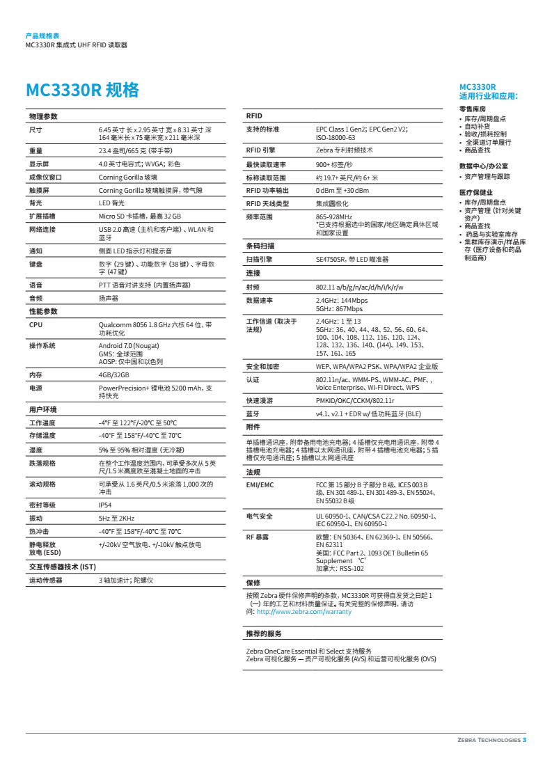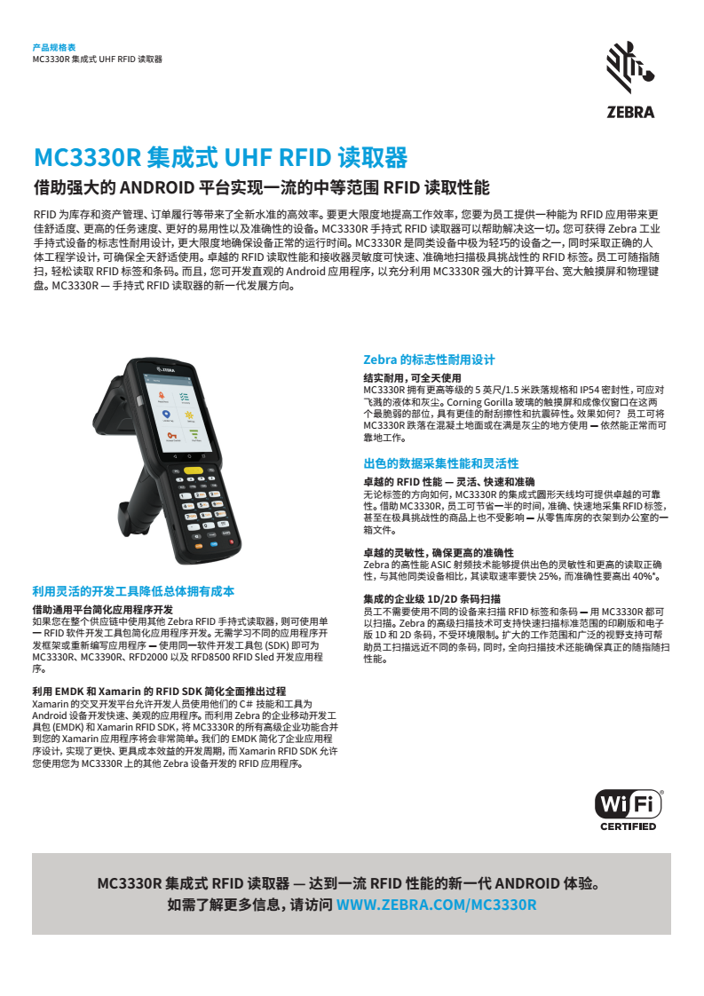 MC3330R RFID 手持讀取器可為您的 RFID 應用帶來全新水準的舒適度、速度、易用性和準確性。卓越的 RFID 讀取性能和接收器靈敏度可快速、準確地掃描極具挑戰性的 RFID 標簽。MC3330R 采用 Zebra 標志性的耐用設計,專為實現更長運行時間打造,同時兼顧輕巧、符合人體工程學特點,可確保全天舒適使用。大觸摸屏、物理鍵盤和 Android 操作系統可為您今天和未來的 RFID 應用需求提供直觀、靈活的平臺。