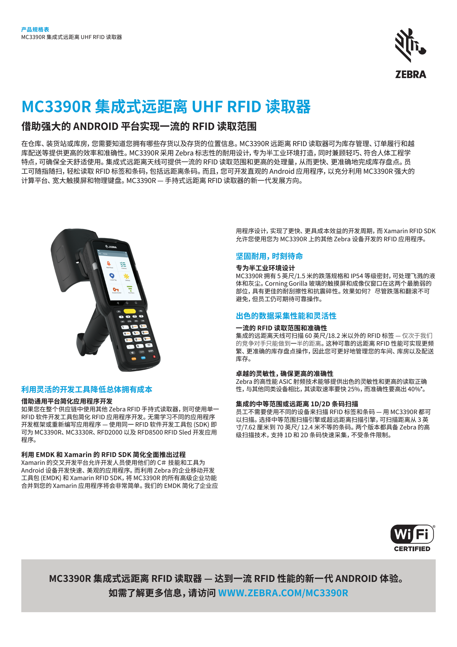 MC3390R 遠距離 RFID 手持讀取器可為庫存管理、訂單履行和越庫配送等提供更高的效率和準確性。集成式遠距離天線支持一流的 RFID 讀取范圍,再加上 Zebra 的高性能 ASIC 射頻技術,可提供更高的處理量,從而更快、更準確地完成庫存盤點。MC3390R 采用 Zebra 標志性的耐用設計,專為半工業環境打造,同時兼顧輕巧、符合人體工程學特點,可確保全天舒適使用。大觸摸屏、物理鍵盤和 Android 操作系統可為您今天和未來的 RFID 應用需求提供直觀、靈活的平臺。
