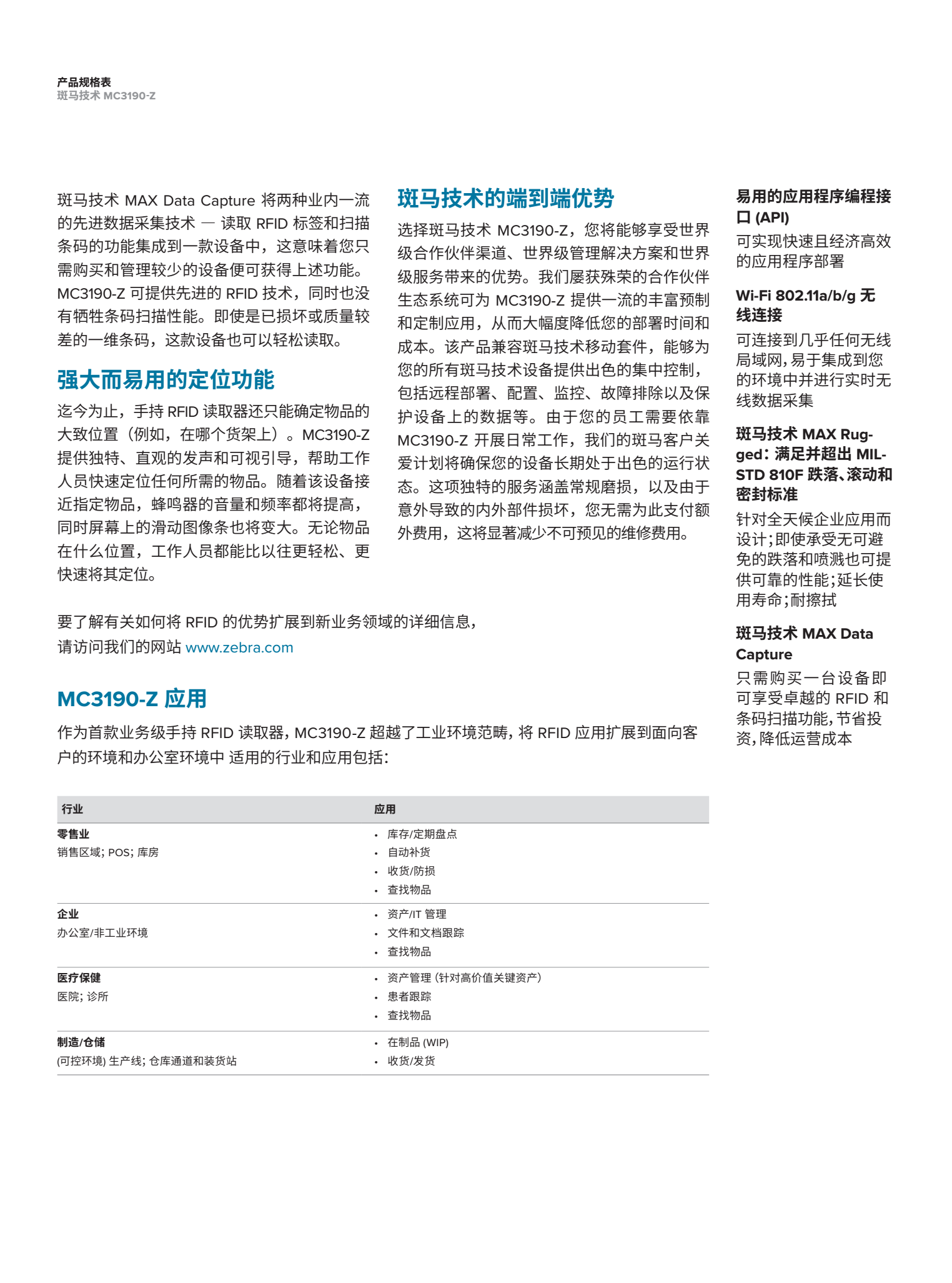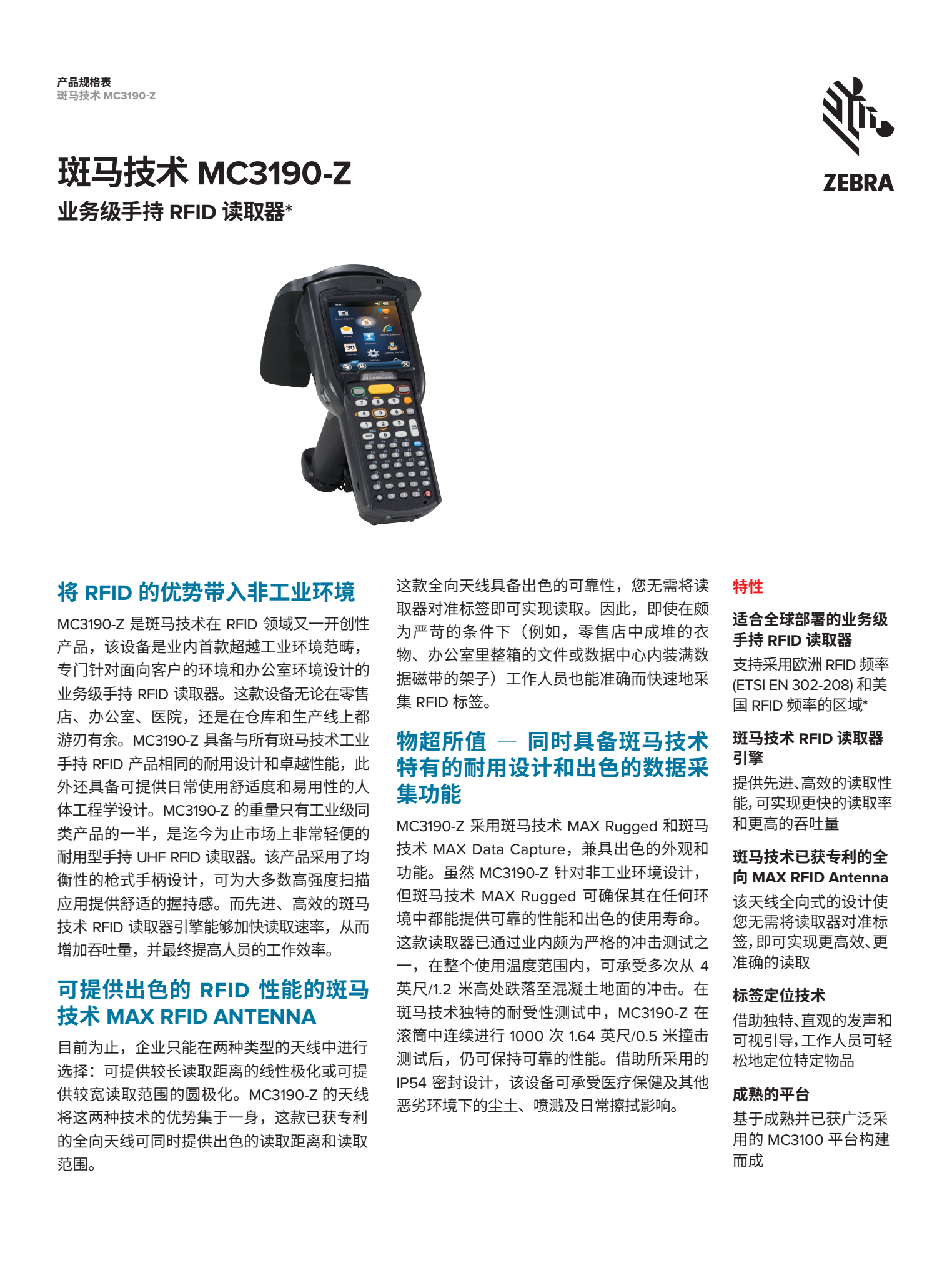 MC3190-Z 具有耐用設計和優異性能,還增配了先進的高效能 RFID 讀取器引擎,可實現更快的讀取速度和更大的吞吐量。新的突破性的方位遲鈍性天線讓它成為極其靈活多用的設備,在零售商店、醫療機構和辦公室等各種面向客戶的環境中都能應付自如。