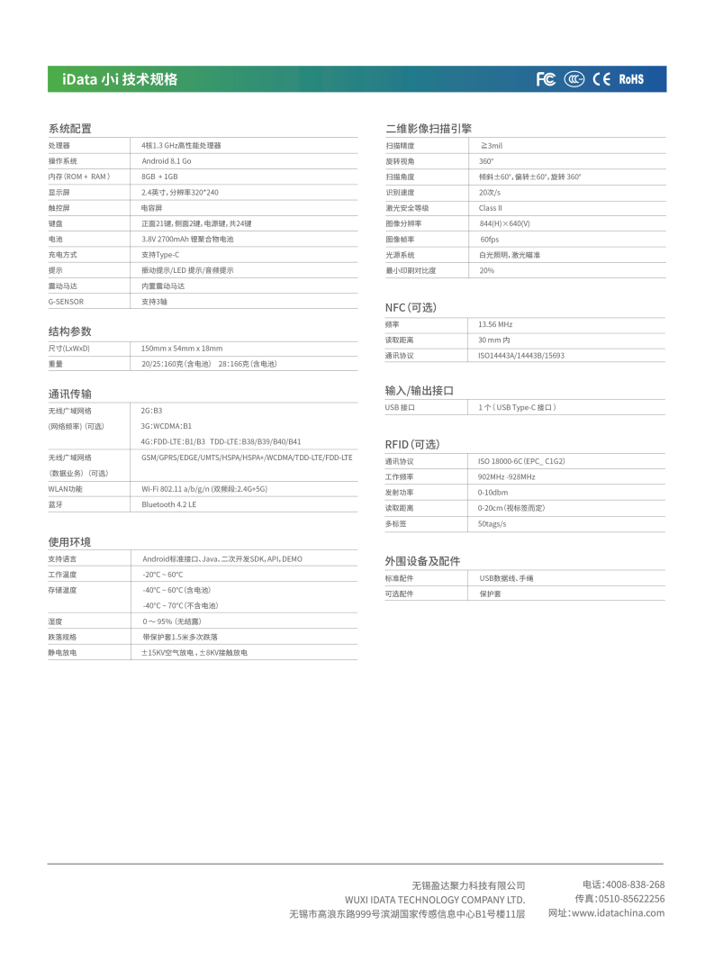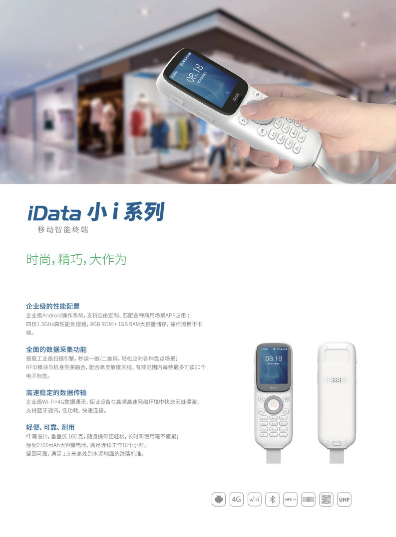 iData 25智能終端,企業級Android操作系統,支持自由定制、匹配各種商用場景APP應用。四核1.3GHz高性能處理器,8GB ROM + 1GB RAM大容量儲存,操作流暢不卡頓。搭載工業級掃描引擎,秒讀一維/二維碼,輕松應對各種盤點場景。纖薄設計,重量僅 160 克,隨身攜帶更輕松,長時間使用毫不疲累。