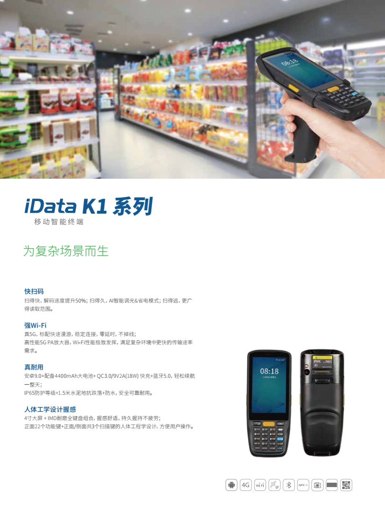 iData K1移動智能終端,為場景而生。人體工程學設計,舒適握感;配備最新的安卓操作系統,八核高端CPU,帶給你飛一般的流暢系統體驗;Wi-Fi傳輸穩定高速,全場景覆蓋;整機重量僅270g,輕巧便攜,可靠耐用;輕松滿足自由深度定制的所有需求。