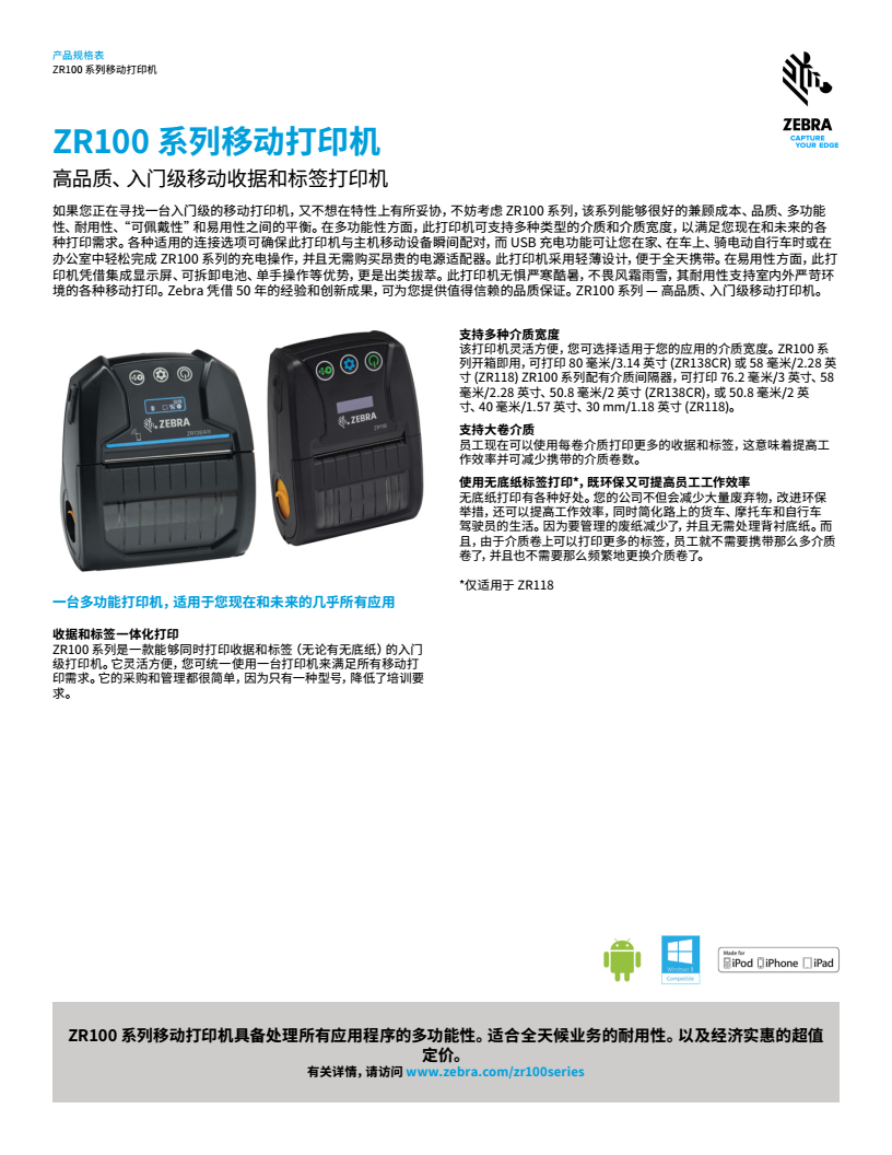 產品簡介: 物有所值的移動收據和標簽打印機 使用 ZR100系列 移動打印機可提高效率,改善工作流。這款經濟實惠的打印機可以打印收據和標簽,其采用輕薄設計,且易于使用。