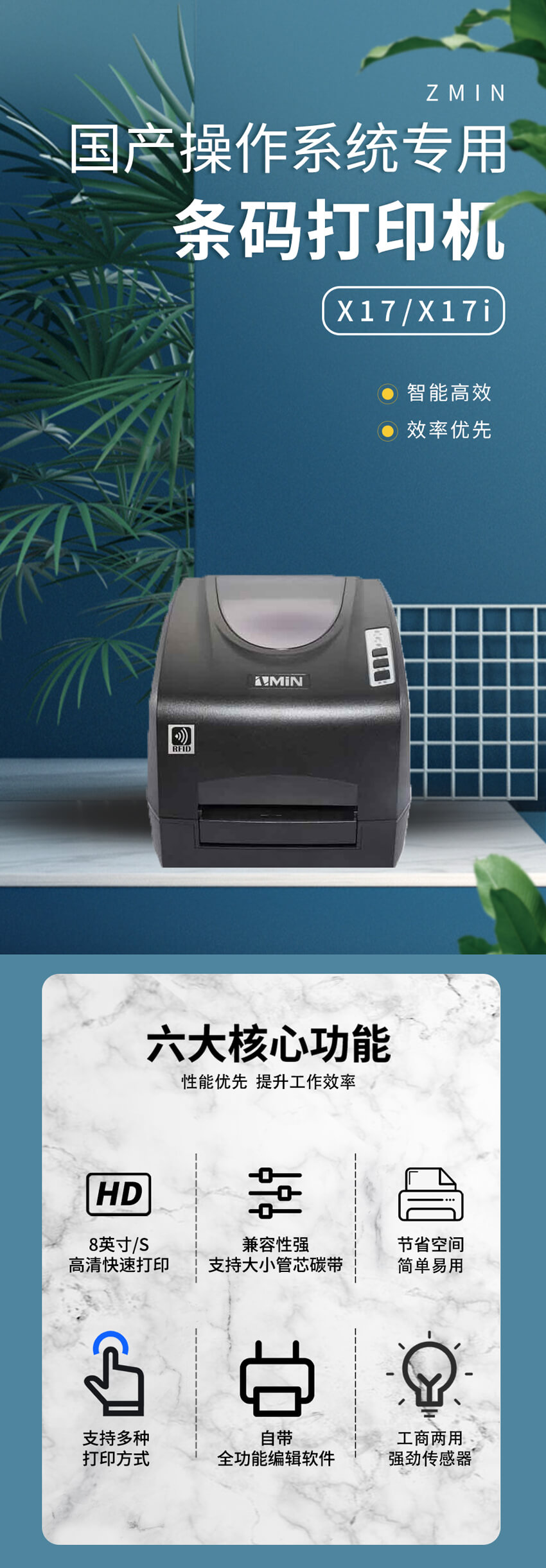 產品簡介: 國產操作系統專用型號X17/X17i,提供完備的應用軟件及二次開發包支持,包含國產系統驅動程序、條碼標簽編輯軟件、網頁打印服務等,將Windows系統下條碼標簽打印的工作無縫切換到國產操作系統。