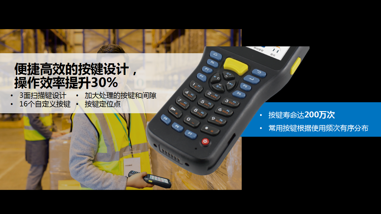 洞察場內(nèi)應(yīng)用使用習(xí)慣,按鍵設(shè)計人性化,簡化操作流程,操作效率提升30%以上。專業(yè)一維/二維掃描引擎,每秒掃描3次以上,一維最遠(yuǎn)5m,二維最遠(yuǎn)1m,輕松識別各種惡劣條碼。