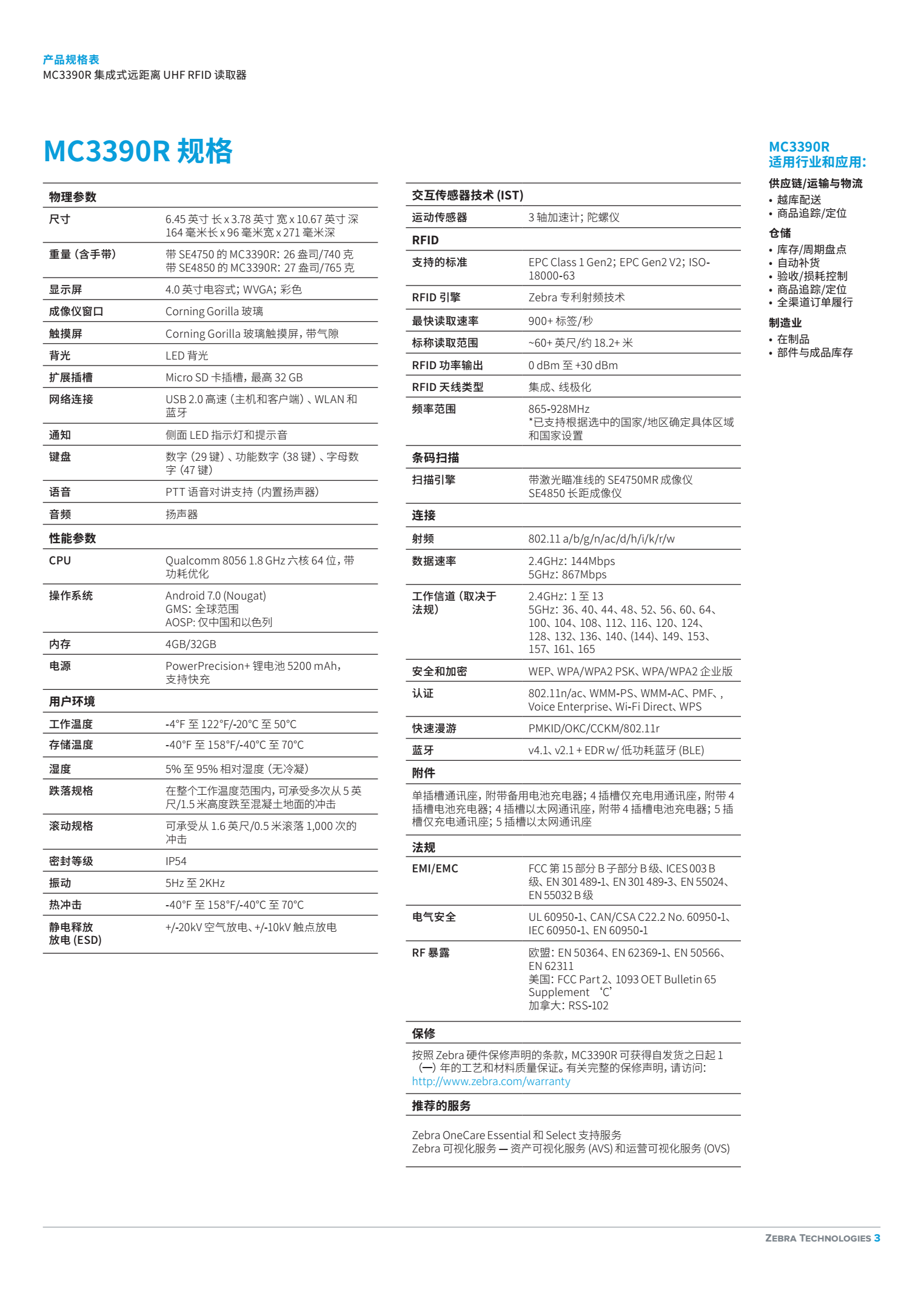 MC3390R 遠距離 RFID 手持讀取器可為庫存管理、訂單履行和越庫配送等提供更高的效率和準確性。集成式遠距離天線支持一流的 RFID 讀取范圍,再加上 Zebra 的高性能 ASIC 射頻技術,可提供更高的處理量,從而更快、更準確地完成庫存盤點。MC3390R 采用 Zebra 標志性的耐用設計,專為半工業環境打造,同時兼顧輕巧、符合人體工程學特點,可確保全天舒適使用。大觸摸屏、物理鍵盤和 Android 操作系統可為您今天和未來的 RFID 應用需求提供直觀、靈活的平臺。