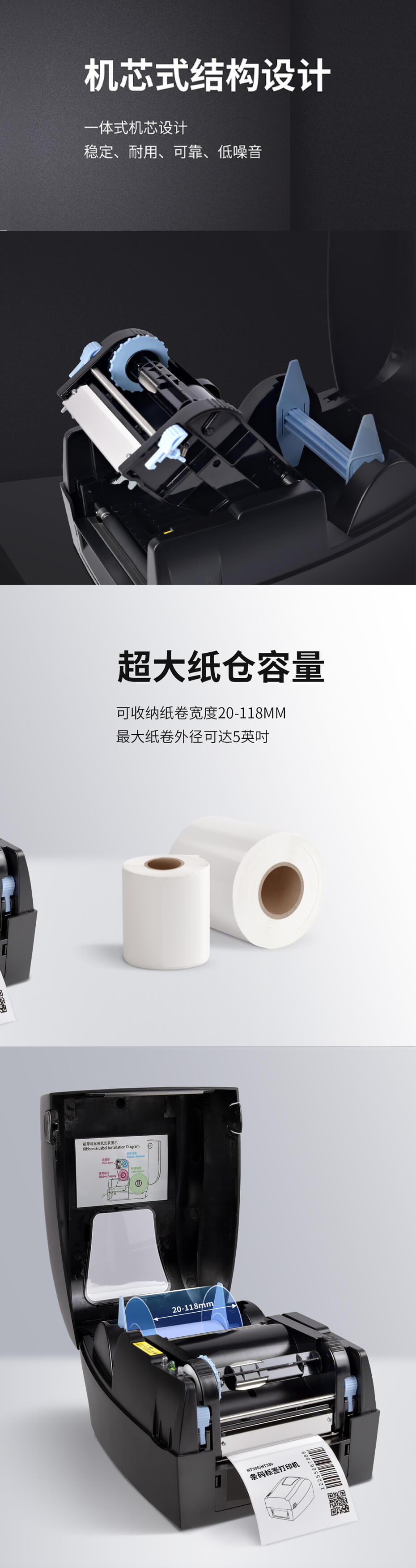碳帶模組設計,使用軸芯組裝碳帶,配合軸芯導槽,安裝操作更簡單,手動輪盤方便碳帶整理,碳帶轉印不摺皺,1吋碳帶管芯,最大碳帶長度300米。