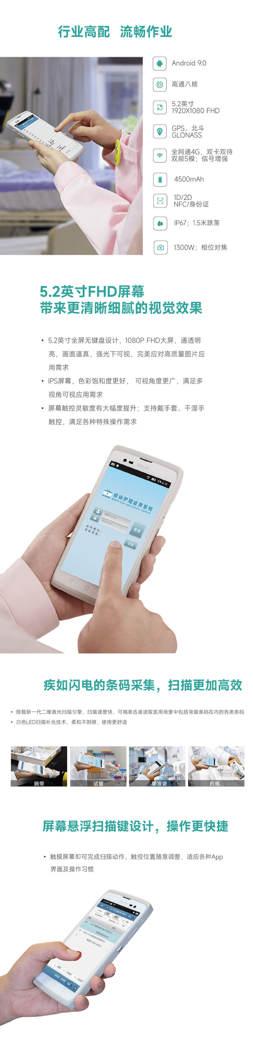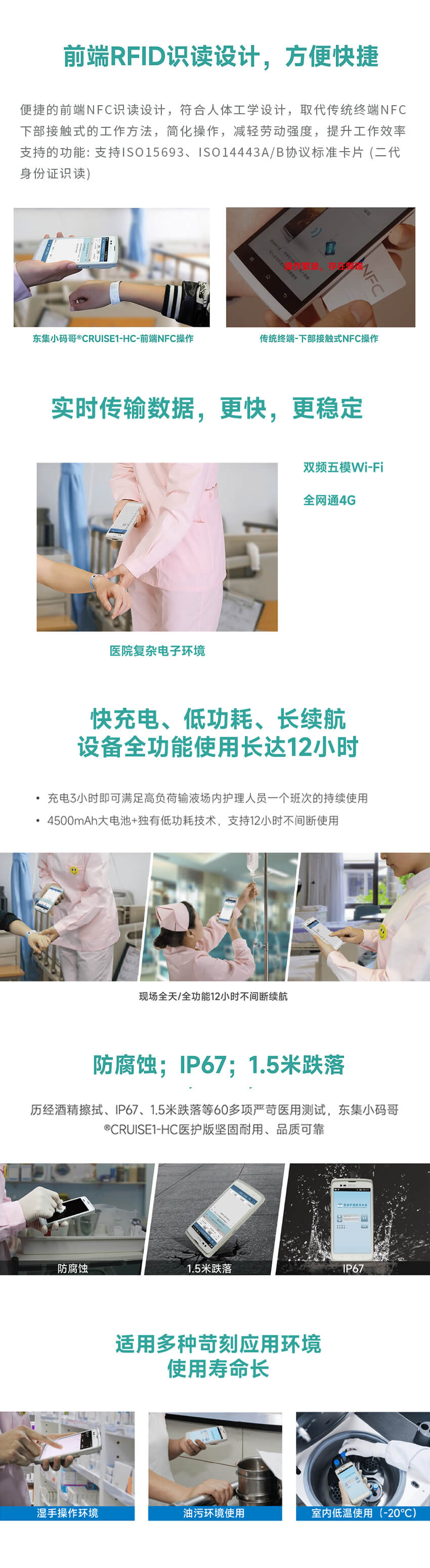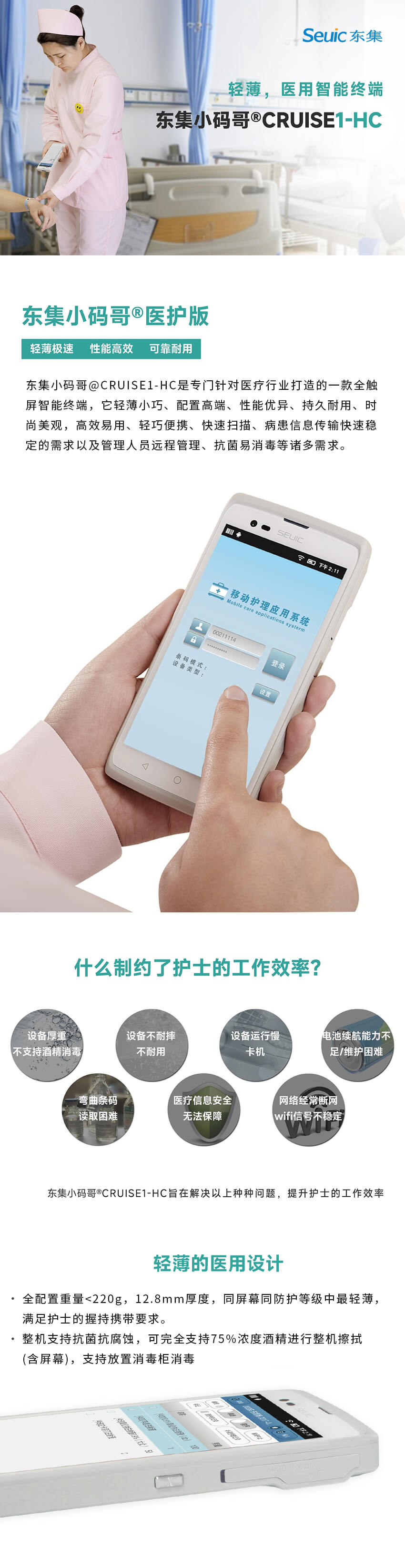 東集小碼哥@CRUISE1-HC是專門針對醫療行業打造的一款全觸屏智能終端,它輕薄小巧、配置高端、性能優異、持久耐用、時尚美觀,滿足護士在使用時對設備高效易用、輕巧便攜、快速掃描、病患信息傳輸快速穩定的需求以及管理人員遠程管理、抗菌易消毒等諸多需求。