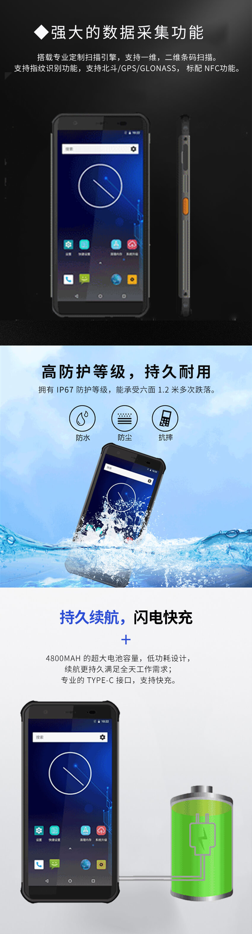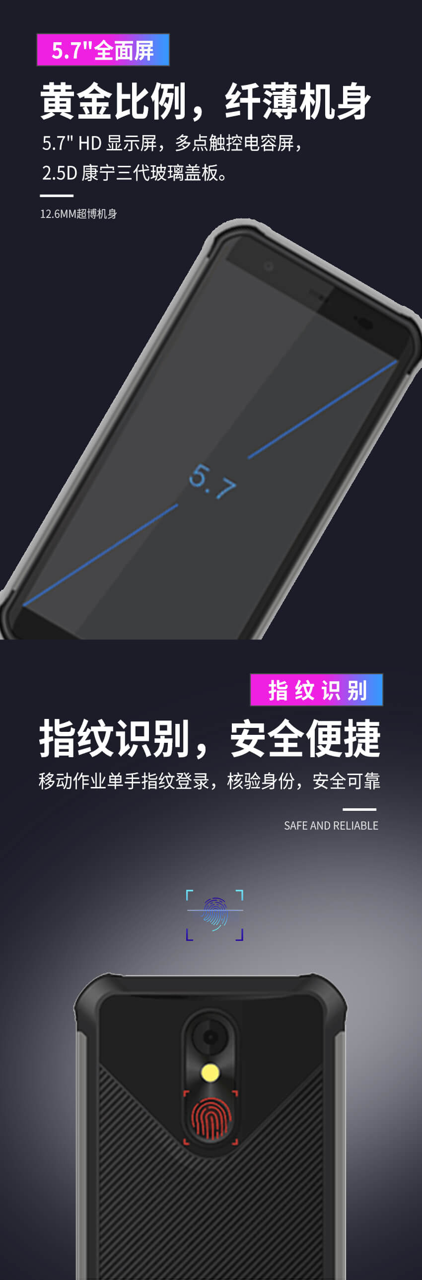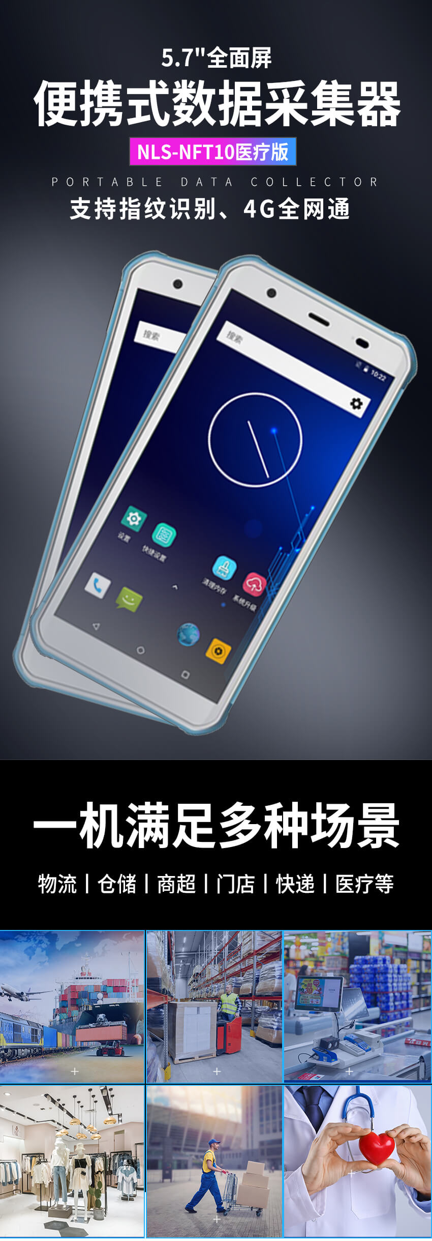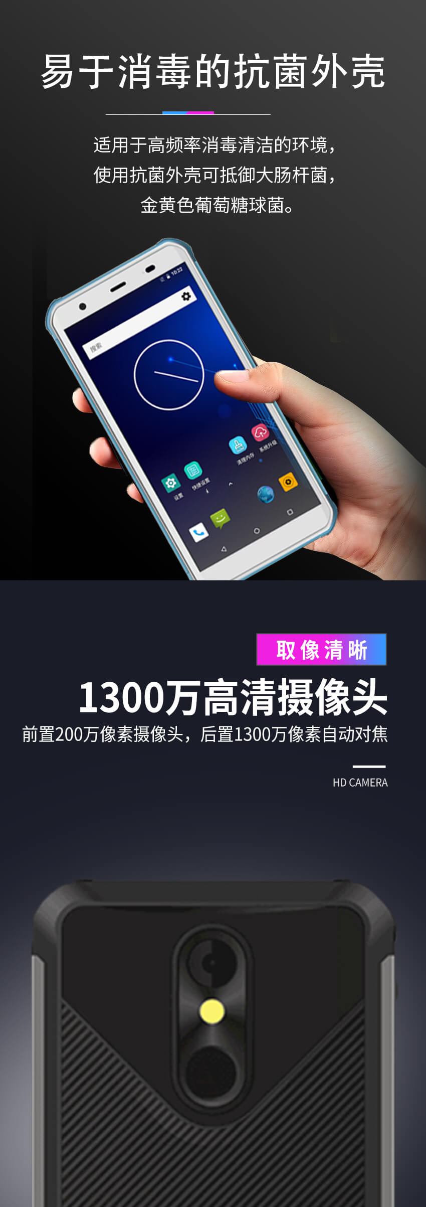 NFT10醫療版機身采用5.7寸(18:9)HD顯示屏,2.5D康寧三代玻璃蓋板,擁有易于消毒的抗菌外殼,IP67高防護等級和12.6mm超薄機身,可配置高速八核處理器,支持指紋識別與快充,適用于醫療衛生場景。